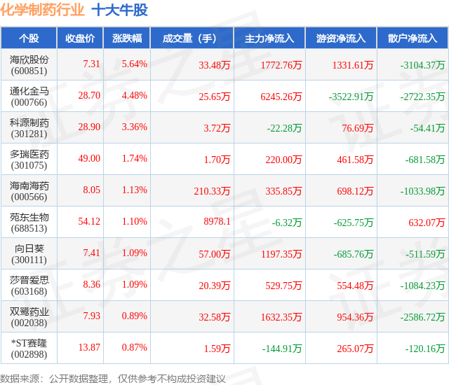 个股表现方面,化学制药行业当日领涨股为海欣股份(600851),该股当日报收7.31,上涨5.64%,成交量33.48万,主力资金净流入1772.76万元。通化金马(000766)以上涨4.48%紧随其后,该股当日成交量25.65万,主力资金净流入6245.26万元。除此之外,科源制药(301281)、多瑞医药(301075)、海南海药(000566)均进入当日牛股之列。具体个股列表见下表: