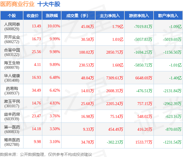 个股表现方面,医药商业行业当日领涨股为人民同泰(600829),该股当日报收13.49,上涨10.03%,成交量45.06万,主力资金净流入1.79亿元。开开实业(600272)以上涨9.99%紧随其后,该股当日成交量30.58万,主力资金净流入1.01亿元。除此之外,合富中国(603122)、海王生物(000078)、华人健康(301408)均进入当日牛股之列。具体个股列表见下表: