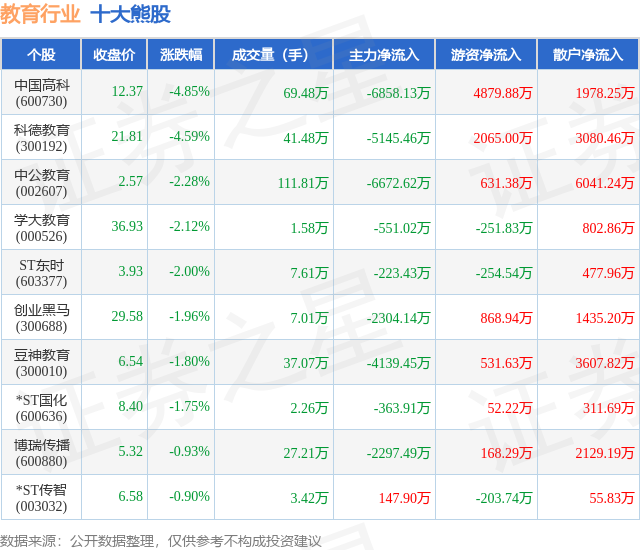 个股表现方面,教育行业当日领跌股为中国高科(600730),该股当日报收12.37,下跌4.85%,成交量69.48万,主力资金净流出6858.13万元。科德教育(300192)以下跌4.59%紧随其后,该股当日成交量41.48万,主力资金净流出5145.46万元。除此之外,中公教育(002607)、学大教育(000526)、ST东时(603377)均进入当日熊股之列。具体个股列表见下表: