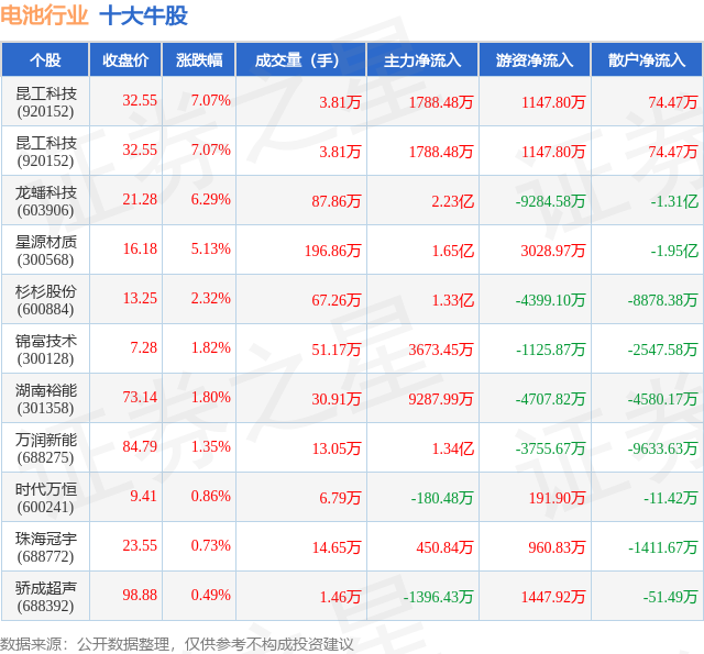 个股表现方面,电池行业当日领涨股为昆工科技(920152),该股当日报收32.55,上涨7.07%,成交量3.81万,主力资金净流入1788.48万元。昆工科技(920152)以上涨7.07%紧随其后,该股当日成交量3.81万,主力资金净流入1788.48万元。除此之外,龙蟠科技(603906)、星源材质(300568)、杉杉股份(600884)均进入当日牛股之列。具体个股列表见下表: