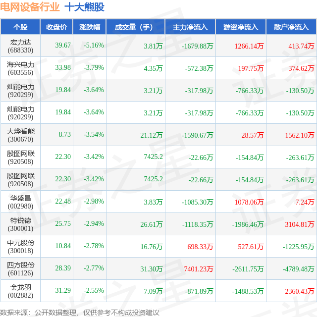 个股表现方面,电网设备行业当日领跌股为宏力达(688330),该股当日报收39.67,下跌5.16%,成交量3.81万,主力资金净流出1679.88万元。海兴电力(603556)以下跌3.79%紧随其后,该股当日成交量4.35万,主力资金净流出572.38万元。除此之外,灿能电力(920299)、灿能电力(920299)、大烨智能(300670)均进入当日熊股之列。具体个股列表见下表:
