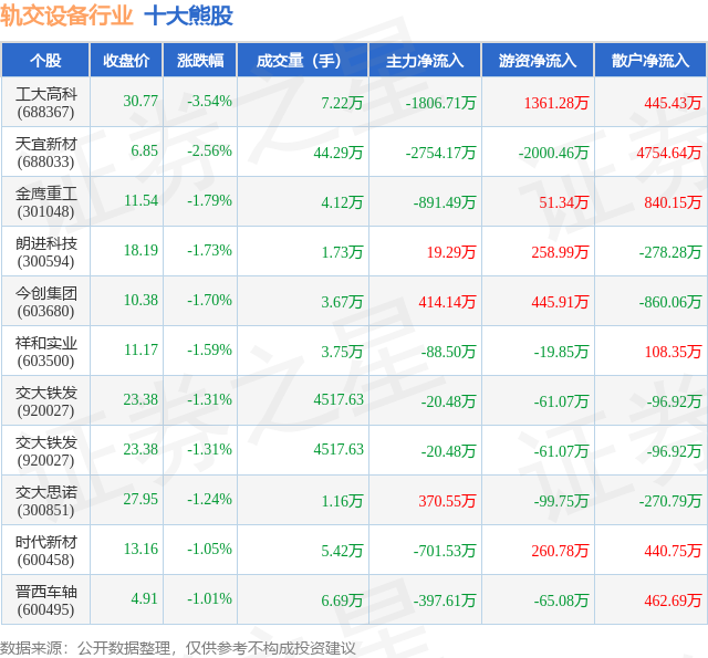 个股表现方面,轨交设备行业当日领跌股为工大高科(688367),该股当日报收30.77,下跌3.54%,成交量7.22万,主力资金净流出1806.71万元。天宜新材(688033)以下跌2.56%紧随其后,该股当日成交量44.29万,主力资金净流出2754.17万元。除此之外,金鹰重工(301048)、朗进科技(300594)、今创集团(603680)均进入当日熊股之列。具体个股列表见下表:
