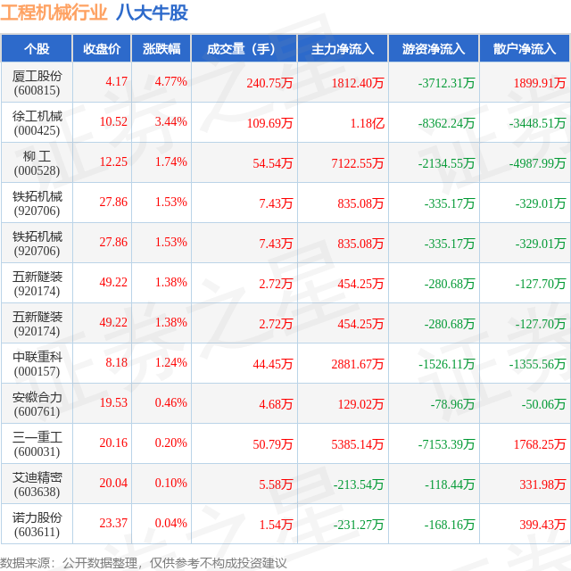 个股表现方面,工程机械行业当日领涨股为厦工股份(600815),该股当日报收4.17,上涨4.77%,成交量240.75万,主力资金净流入1812.4万元。徐工机械(000425)以上涨3.44%紧随其后,该股当日成交量109.69万,主力资金净流入1.18亿元。除此之外,柳 工(000528)、铁拓机械(920706)、铁拓机械(920706)均进入当日牛股之列。具体个股列表见下表: