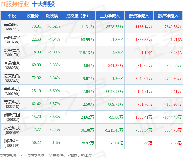 个股表现方面,IT服务行业当日领跌股为品高股份(688227),该股当日报收73.01,下跌9.62%,成交量11.31万,主力资金净流出8528.73万元。南网数字(301638)以下跌4.64%紧随其后,该股当日成交量60.99万,主力资金净流出1.85亿元。除此之外,汉得信息(300170)、卓易信息(688258)、云天励飞(688343)均进入当日熊股之列。具体个股列表见下表: