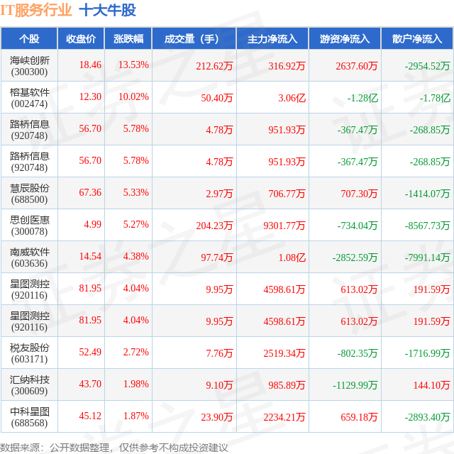 个股表现方面,IT服务行业当日领涨股为海峡创新(300300),该股当日报收18.46,上涨13.53%,成交量212.62万,主力资金净流入316.92万元。榕基软件(002474)以上涨10.02%紧随其后,该股当日成交量50.4万,主力资金净流入3.06亿元。除此之外,路桥信息(920748)、路桥信息(920748)、慧辰股份(688500)均进入当日牛股之列。具体个股列表见下表: