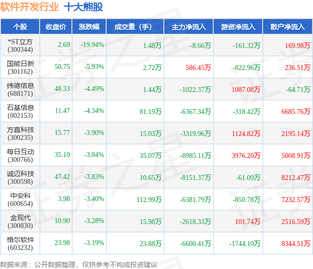 个股表现方面,软件开发行业当日领跌股为*ST立方(300344),该股当日报收2.69,下跌19.94%,成交量1.48万,主力资金净流出8.66万元。国能日新(301162)以下跌5.93%紧随其后,该股当日成交量2.72万,主力资金净流入586.45万元。除此之外,纬德信息(688171)、石基信息(002153)、方直科技(300235)均进入当日熊股之列。具体个股列表见下表: