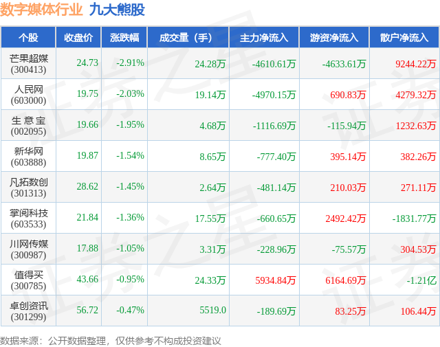 个股表现方面,数字媒体行业当日领跌股为芒果超媒(300413),该股当日报收24.73,下跌2.91%,成交量24.28万,主力资金净流出4610.61万元。人民网(603000)以下跌2.03%紧随其后,该股当日成交量19.14万,主力资金净流出4970.15万元。除此之外,生 意 宝(002095)、新华网(603888)、凡拓数创(301313)均进入当日熊股之列。具体个股列表见下表: