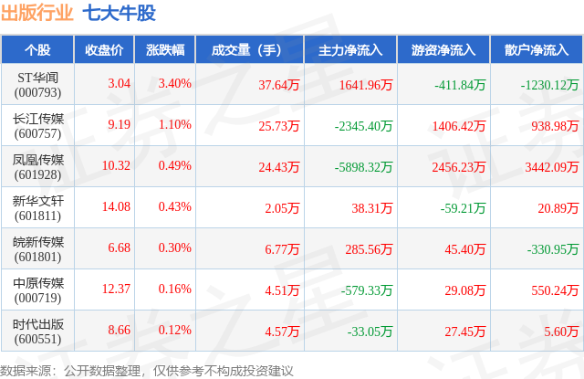 个股表现方面,出版行业当日领涨股为ST华闻(000793),该股当日报收3.04,上涨3.4%,成交量37.64万,主力资金净流入1641.96万元。长江传媒(600757)以上涨1.1%紧随其后,该股当日成交量25.73万,主力资金净流出2345.4万元。除此之外,凤凰传媒(601928)、新华文轩(601811)、皖新传媒(601801)均进入当日牛股之列。具体个股列表见下表: