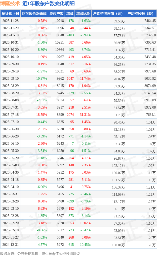 从股价来看,2025年11月20日至2025年11月28日,博隆技术区间涨幅为0.78%,在此期间股东户数减少178.0户,减幅为1.63%。