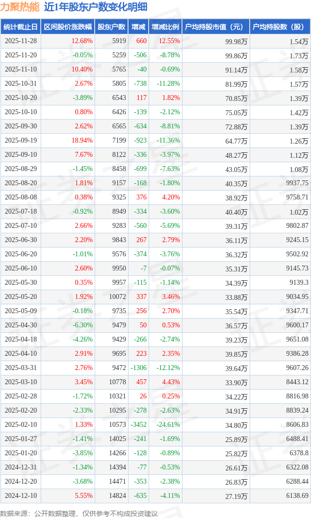 从股价来看,2025年11月20日至2025年11月28日,力聚热能区间涨幅为12.68%,在此期间股东户数增加660.0户,增幅为12.55%。