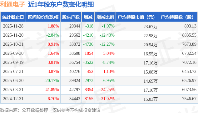 从股价来看,2025年11月20日至2025年11月28日,利通电子区间涨幅为1.88%,在此期间股东户数减少318.0户,减幅为1.07%。