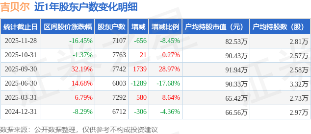 从股价来看,2025年10月31日至2025年11月28日,吉贝尔区间跌幅为16.45%,在此期间股东户数减少656.0户,减幅为8.45%。