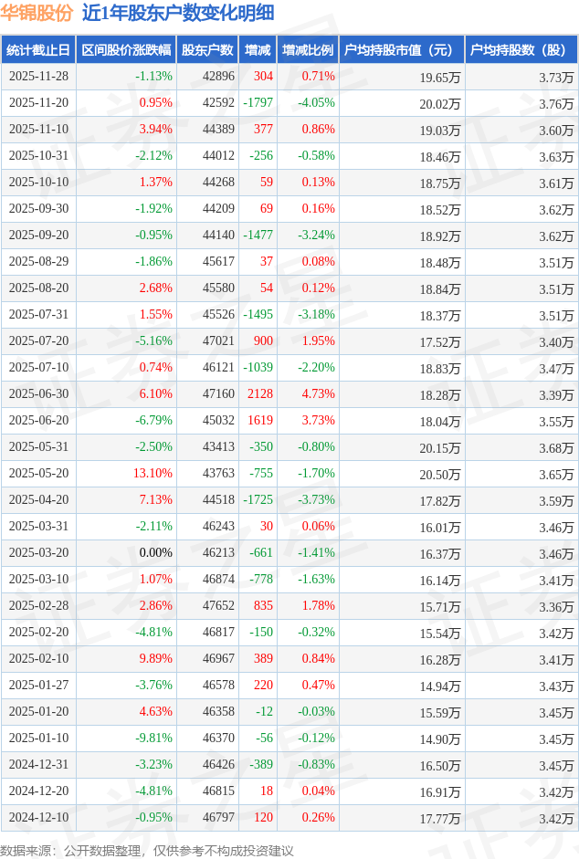 从股价来看,2025年11月20日至2025年11月28日,华锦股份区间跌幅为1.13%,在此期间股东户数增加304.0户,增幅为0.71%。