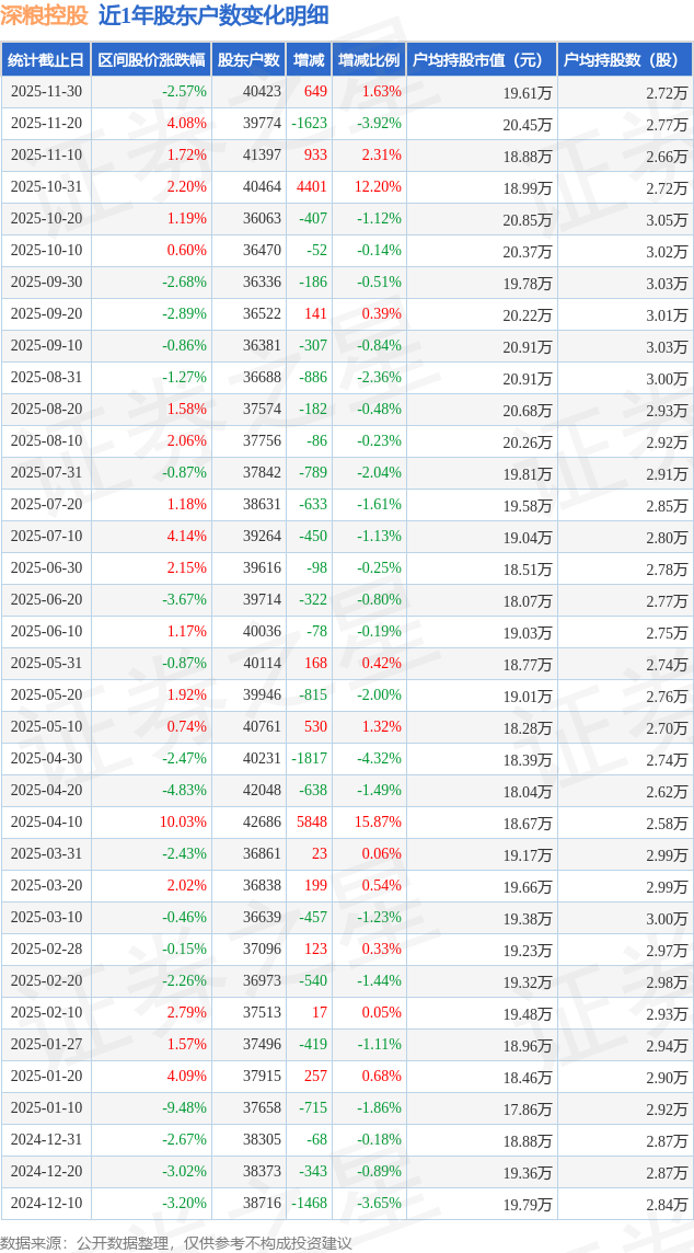 从股价来看,2025年11月20日至2025年11月30日,深粮控股区间跌幅为2.57%,在此期间股东户数增加649.0户,增幅为1.63%。