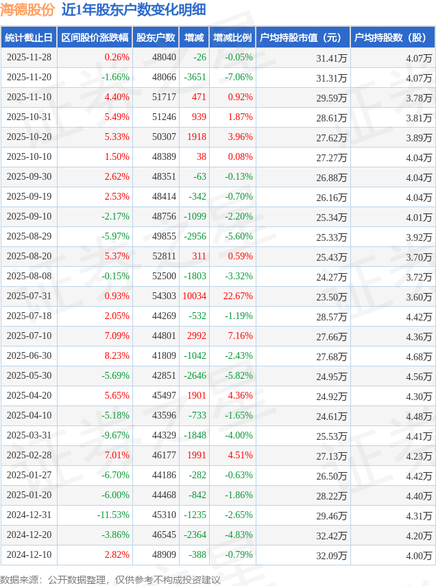 从股价来看,2025年11月20日至2025年11月28日,海德股份区间涨幅为0.26%,在此期间股东户数减少26.0户,减幅为0.05%。