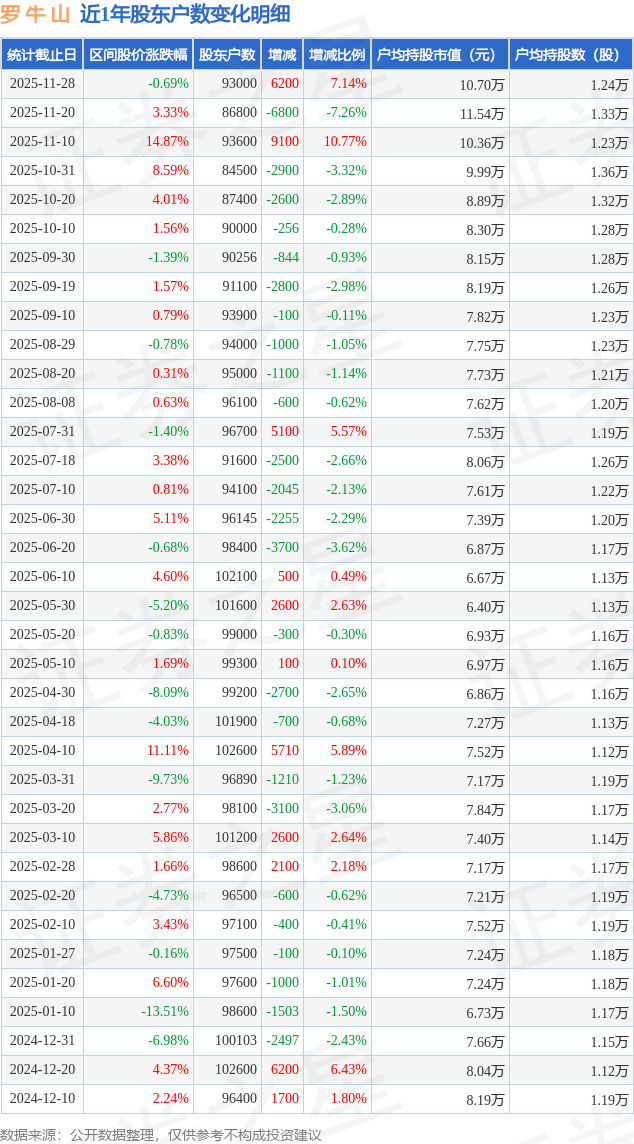 从股价来看,2025年11月20日至2025年11月28日,罗 牛 山区间跌幅为0.69%,在此期间股东户数增加6200.0户,增幅为7.14%。