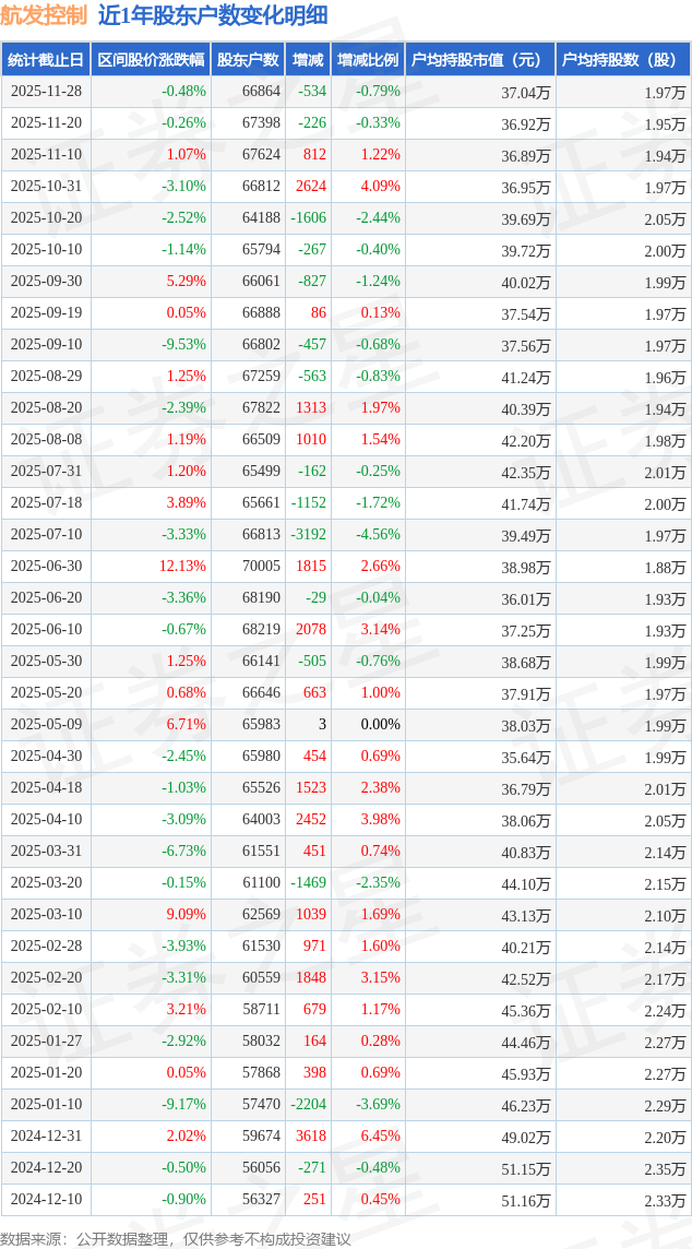 从股价来看,2025年11月20日至2025年11月28日,航发控制区间跌幅为0.48%,在此期间股东户数减少534.0户,减幅为0.79%。