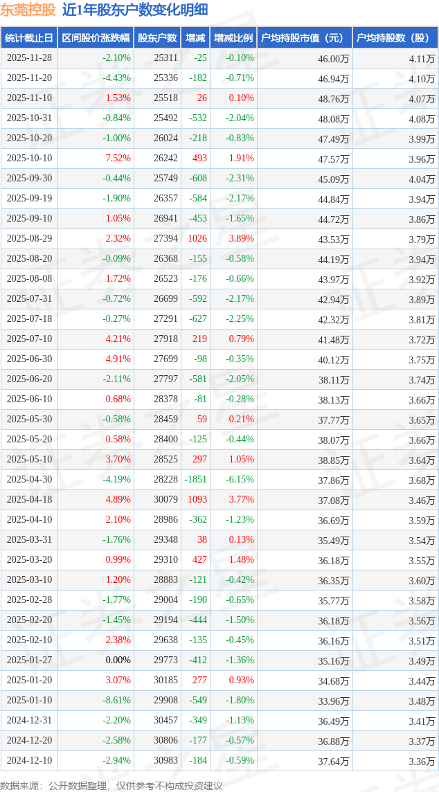从股价来看,2025年11月20日至2025年11月28日,东莞控股区间跌幅为2.1%,在此期间股东户数减少25.0户,减幅为0.1%。