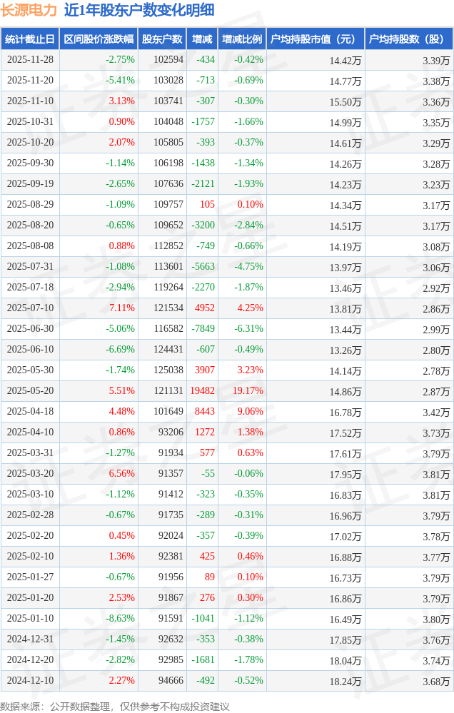 从股价来看,2025年11月20日至2025年11月28日,长源电力区间跌幅为2.75%,在此期间股东户数减少434.0户,减幅为0.42%。