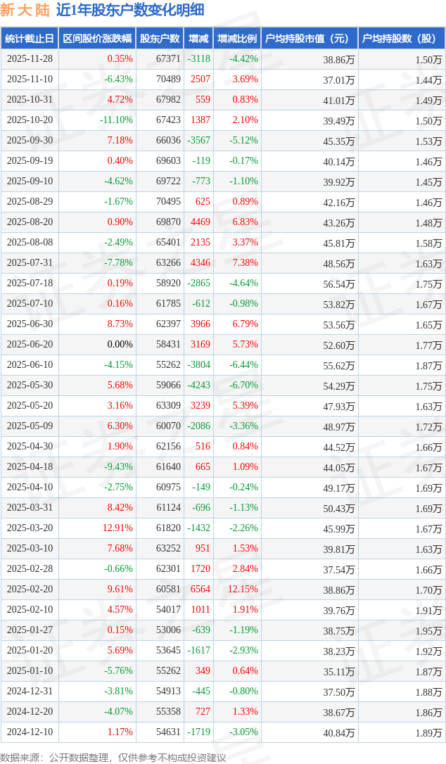 从股价来看,2025年11月10日至2025年11月28日,新 大 陆区间涨幅为0.35%,在此期间股东户数减少3118.0户,减幅为4.42%。