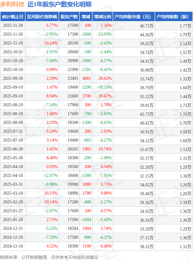 从股价来看,2025年11月20日至2025年11月28日,多利科技区间涨幅为6.77%,在此期间股东户数增加200.0户,增幅为1.16%。