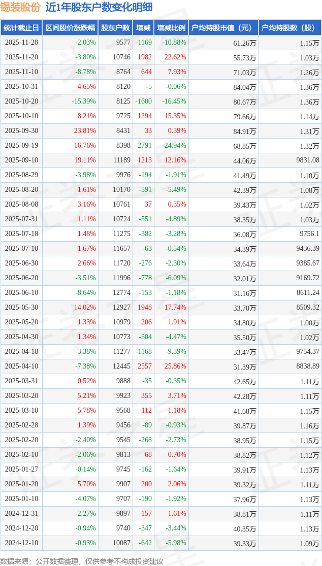 从股价来看,2025年11月20日至2025年11月28日,锡装股份区间跌幅为2.03%,在此期间股东户数减少1169.0户,减幅为10.88%。