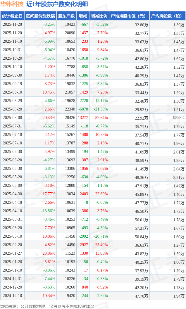 从股价来看,2025年11月20日至2025年11月28日,华纬科技区间跌幅为3.25%,在此期间股东户数减少667.0户,减幅为3.32%。
