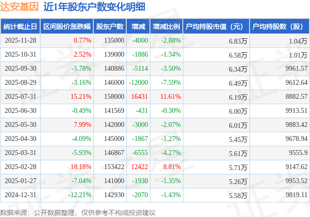从股价来看,2025年10月31日至2025年11月28日,达安基因区间涨幅为0.77%,在此期间股东户数减少4000.0户,减幅为2.88%。