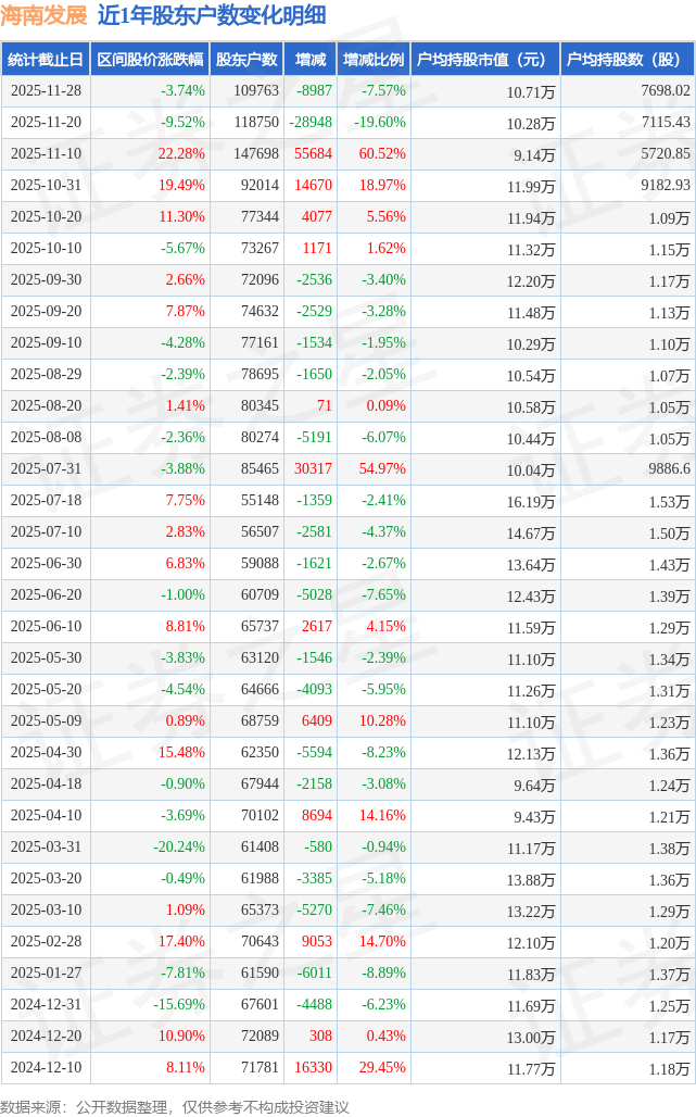 从股价来看,2025年11月20日至2025年11月28日,海南发展区间跌幅为3.74%,在此期间股东户数减少8987.0户,减幅为7.57%。