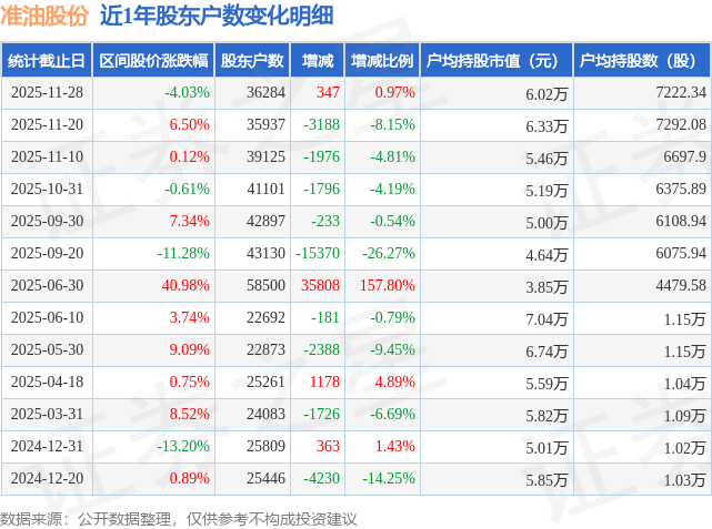 从股价来看,2025年11月20日至2025年11月28日,准油股份区间跌幅为4.03%,在此期间股东户数增加347.0户,增幅为0.97%。