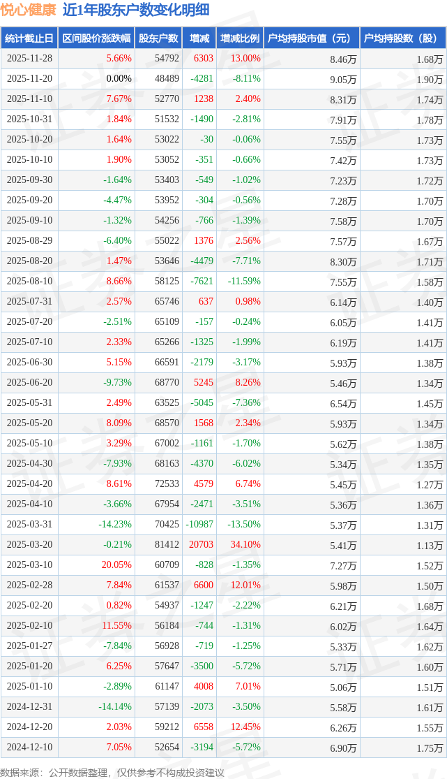 从股价来看,2025年11月20日至2025年11月28日,悦心健康区间涨幅为5.66%,在此期间股东户数增加6303.0户,增幅为13.0%。