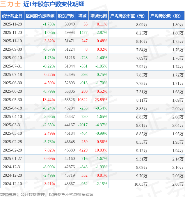 从股价来看,2025年11月20日至2025年11月28日,三 力 士区间跌幅为1.75%,在此期间股东户数增加55.0户,增幅为0.11%。