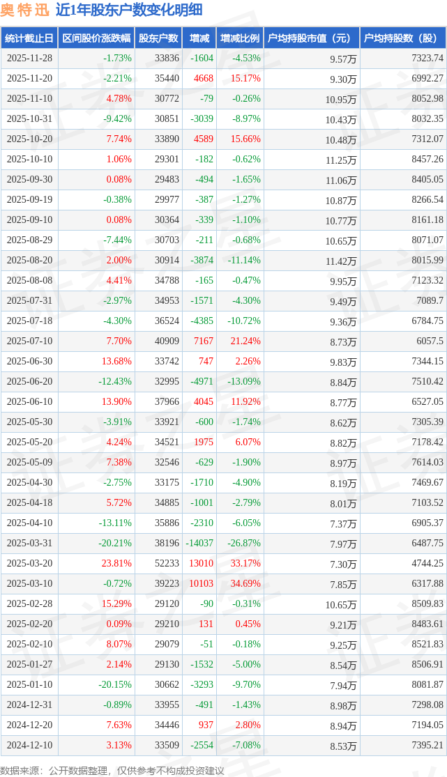 从股价来看,2025年11月20日至2025年11月28日,奥 特 迅区间跌幅为1.73%,在此期间股东户数减少1604.0户,减幅为4.53%。