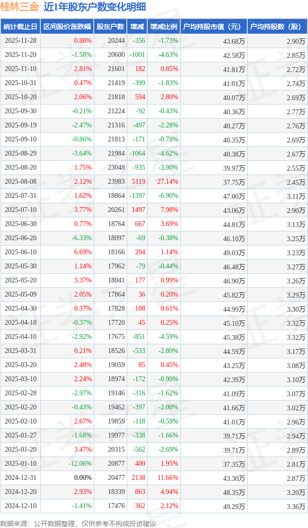 从股价来看,2025年11月20日至2025年11月28日,桂林三金区间涨幅为0.8%,在此期间股东户数减少356.0户,减幅为1.73%。