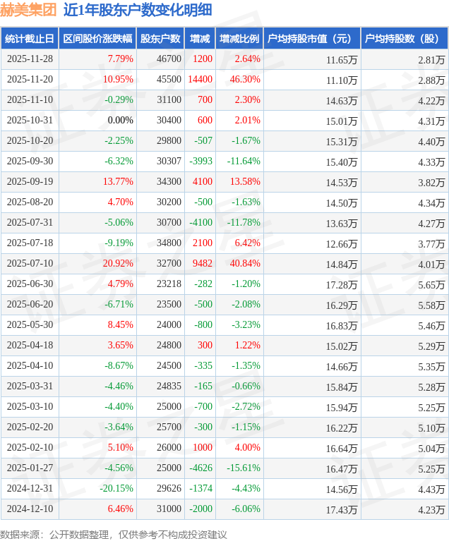 从股价来看,2025年11月20日至2025年11月28日,赫美集团区间涨幅为7.79%,在此期间股东户数增加1200.0户,增幅为2.64%。