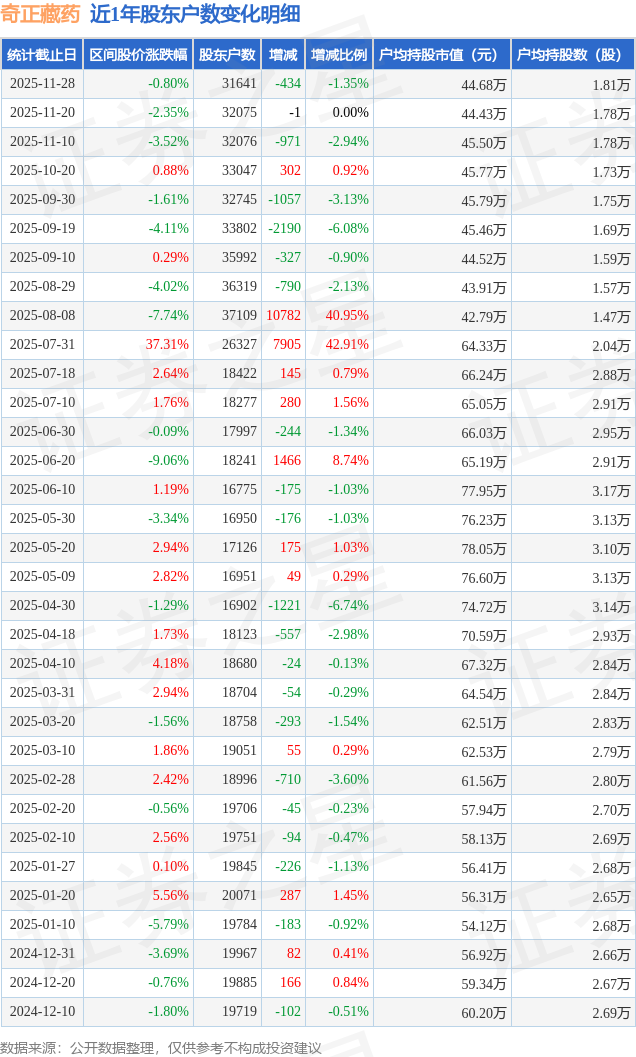 从股价来看,2025年11月20日至2025年11月28日,奇正藏药区间跌幅为0.8%,在此期间股东户数减少434.0户,减幅为1.35%。