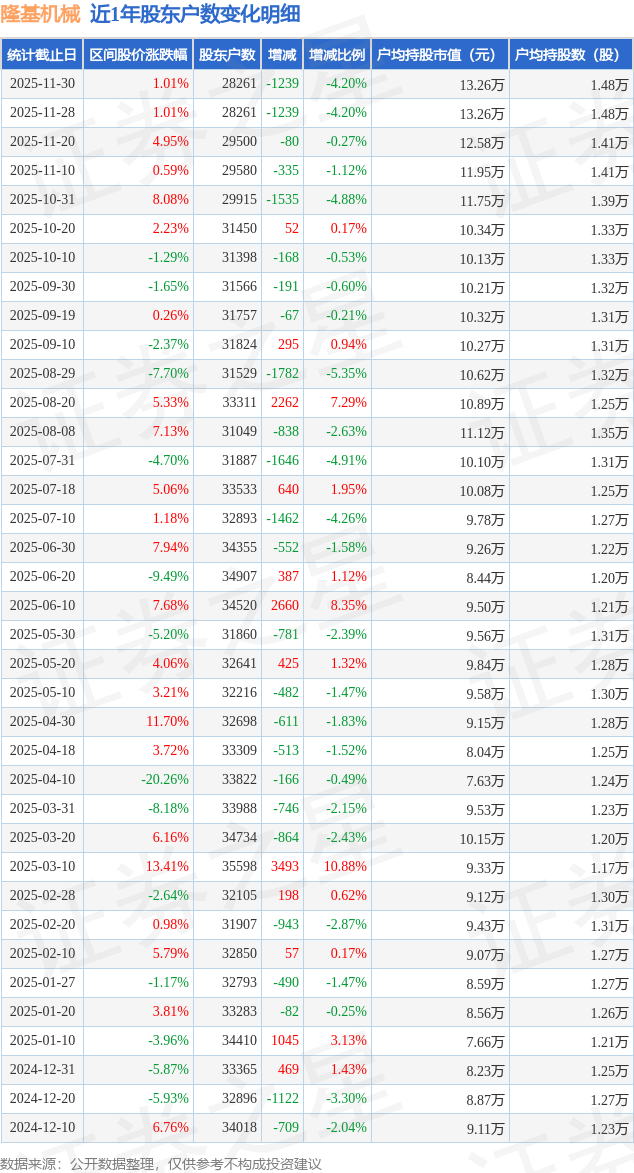 从股价来看,2025年11月20日至2025年11月30日,隆基机械区间涨幅为1.01%,在此期间股东户数减少1239.0户,减幅为4.2%。
