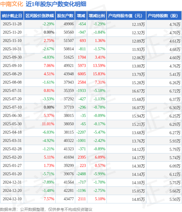 从股价来看,2025年11月20日至2025年11月28日,中南文化区间跌幅为2.29%,在此期间股东户数减少654.0户,减幅为1.29%。