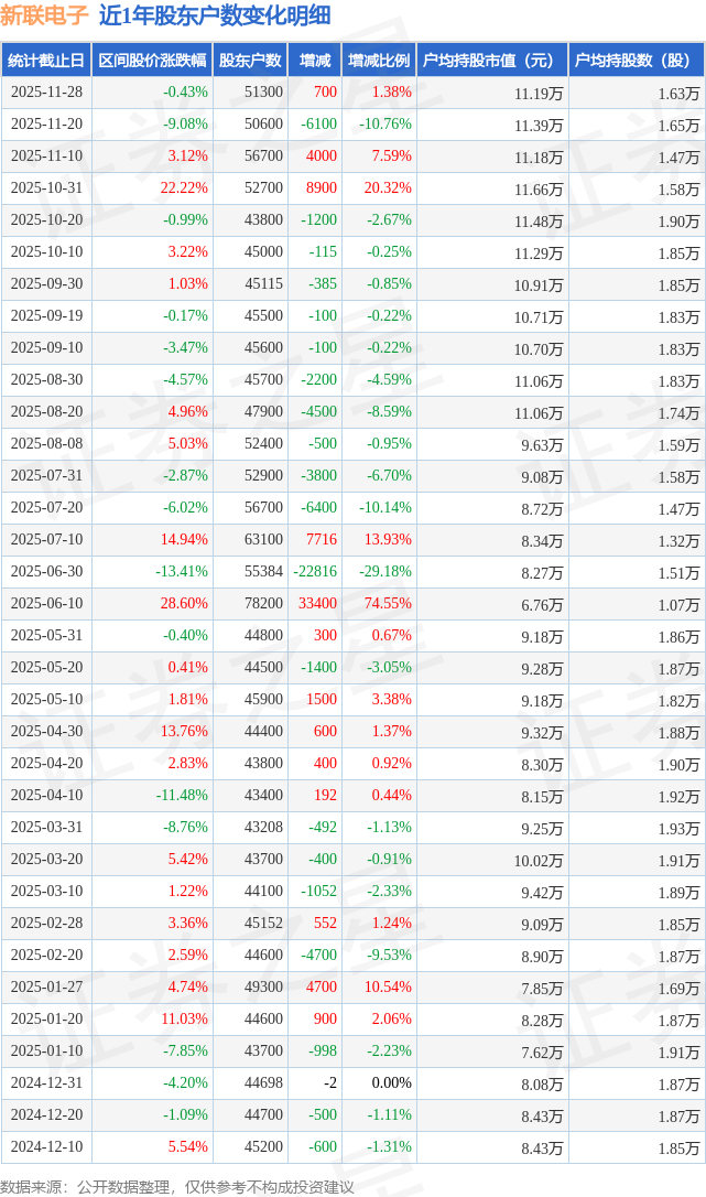 从股价来看,2025年11月20日至2025年11月28日,新联电子区间跌幅为0.43%,在此期间股东户数增加700.0户,增幅为1.38%。