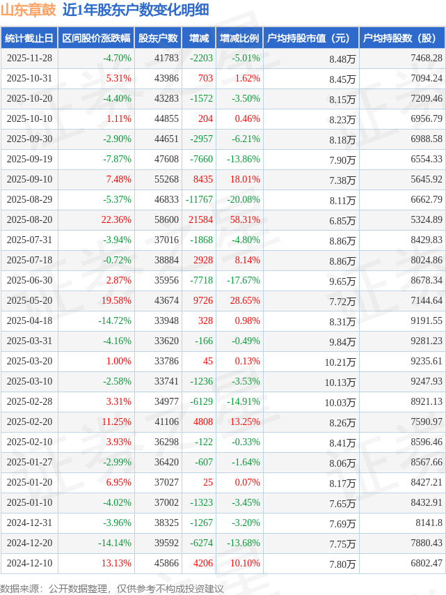 从股价来看,2025年10月31日至2025年11月28日,山东章鼓区间跌幅为4.7%,在此期间股东户数减少2203.0户,减幅为5.01%。