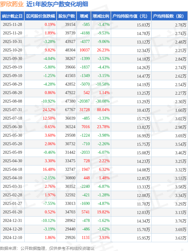 从股价来看,2025年11月20日至2025年11月28日,罗欣药业区间涨幅为0.19%,在此期间股东户数减少585.0户,减幅为1.47%。