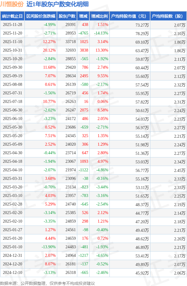 从股价来看,2025年11月20日至2025年11月28日,川恒股份区间跌幅为4.99%,在此期间股东户数增加438.0户,增幅为1.51%。