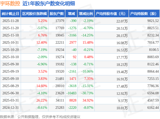 从股价来看,2025年11月20日至2025年11月28日,宇环数控区间涨幅为5.25%,在此期间股东户数减少390.0户,减幅为2.19%。