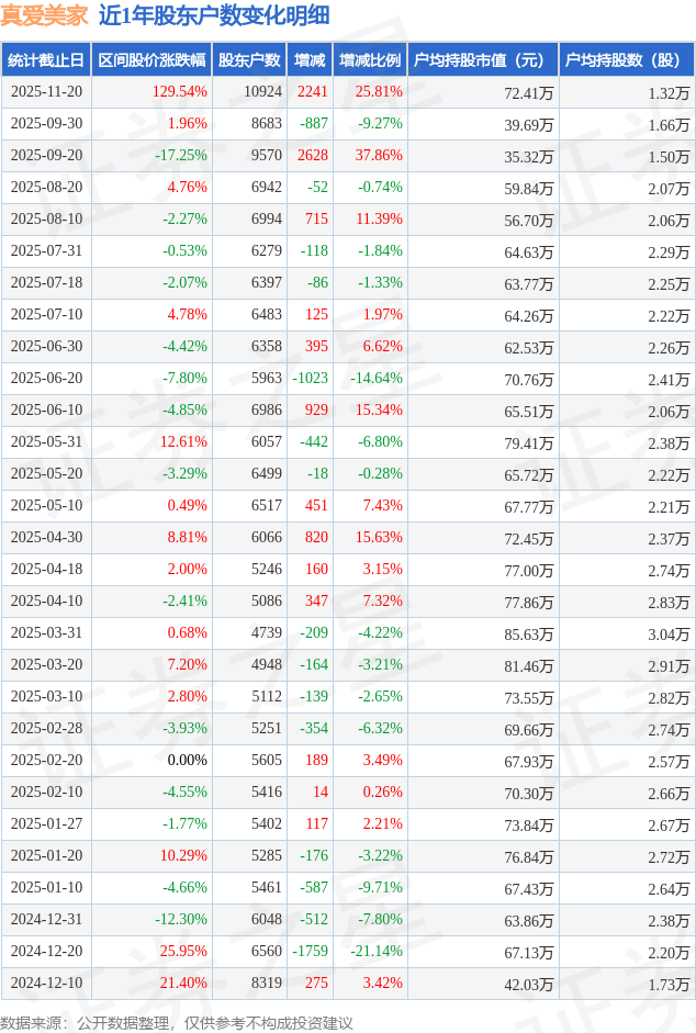 证券之星消息,近日真爱美家披露,截至2025年11月20日公司股东户数为1.09万户,较9月30日增加2241.0户,增幅为25.81%。户均持股数量由上期的1.66万股减少至1.32万股,户均持股市值为72.41万元。