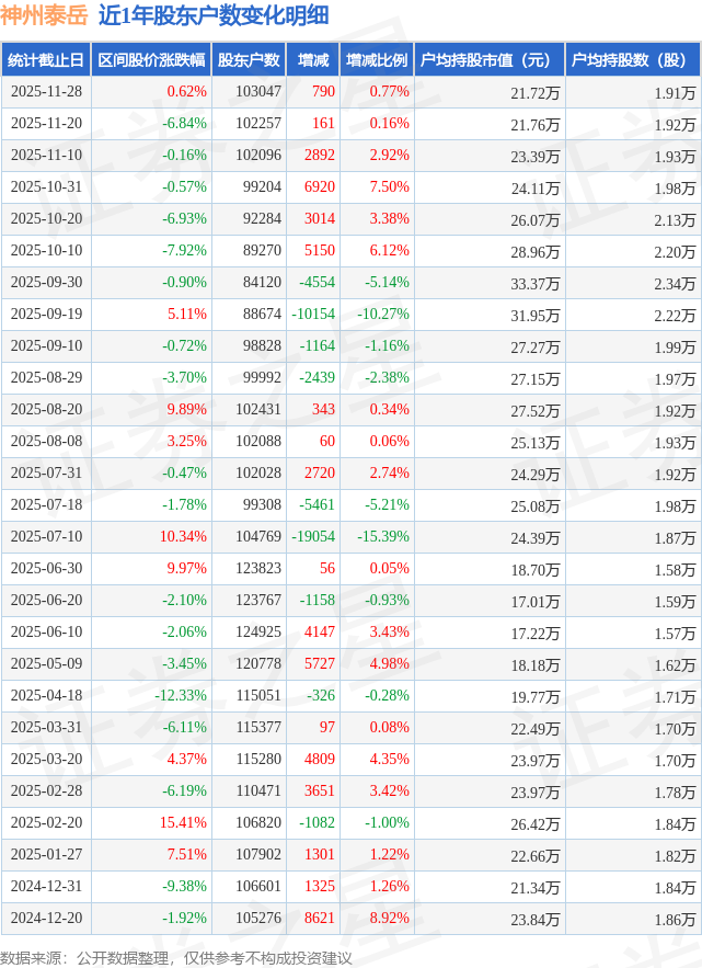 从股价来看,2025年11月20日至2025年11月28日,神州泰岳区间涨幅为0.62%,在此期间股东户数增加790.0户,增幅为0.77%。