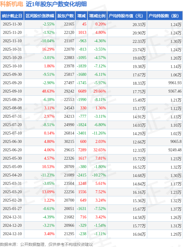 从股价来看,2025年11月20日至2025年11月30日,科新机电区间跌幅为2.55%,在此期间股东户数增加45.0户,增幅为0.2%。