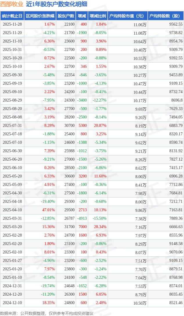 从股价来看,2025年11月20日至2025年11月28日,西部牧业区间涨幅为1.67%,在此期间股东户数增加400.0户,增幅为1.84%。