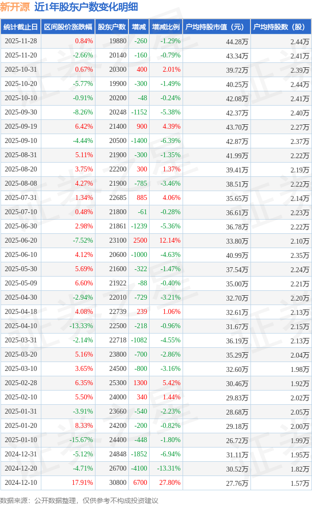从股价来看,2025年11月20日至2025年11月28日,新开源区间涨幅为0.84%,在此期间股东户数减少260.0户,减幅为1.29%。