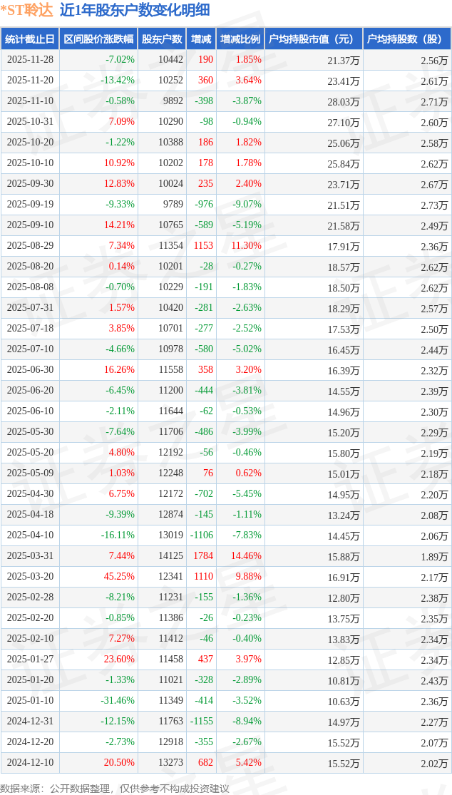 从股价来看,2025年11月20日至2025年11月28日,*ST聆达区间跌幅为7.02%,在此期间股东户数增加190.0户,增幅为1.85%。