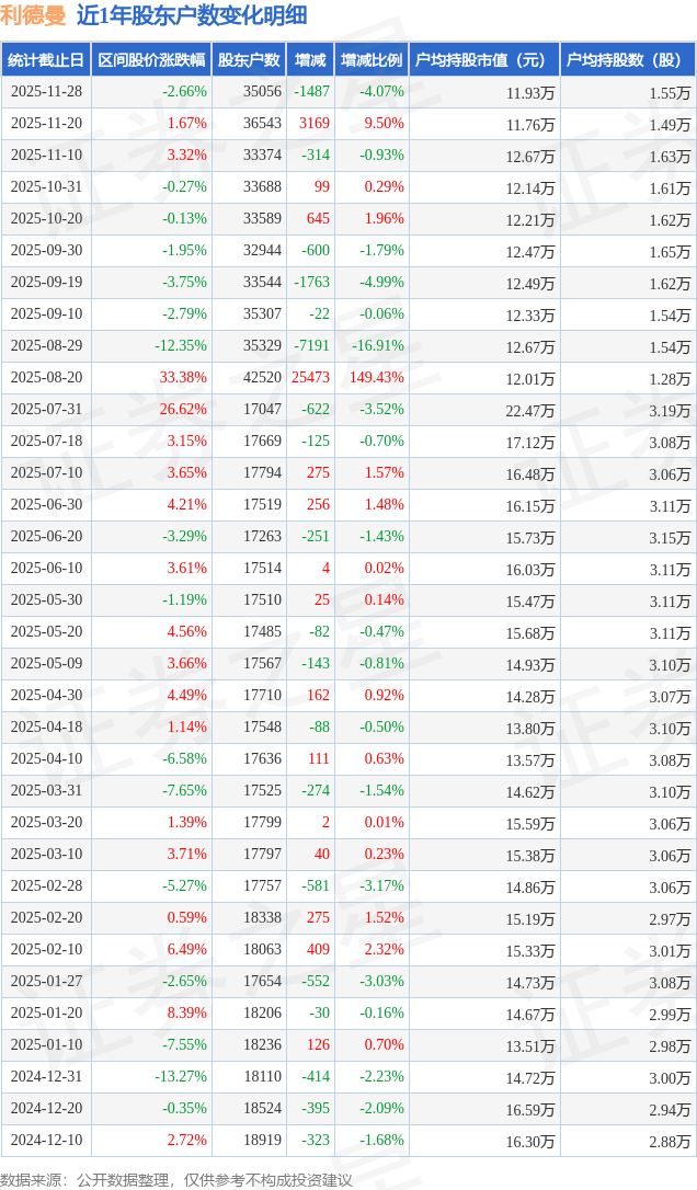 从股价来看,2025年11月20日至2025年11月28日,利德曼区间跌幅为2.66%,在此期间股东户数减少1487.0户,减幅为4.07%。